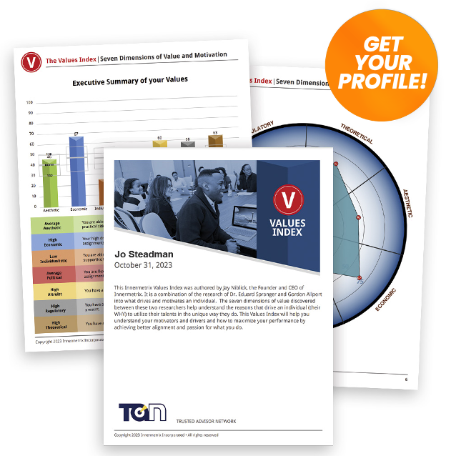 - The top 2-3 Values of your profile are assessed as your “Core Values”.